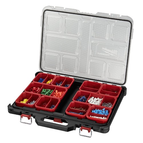 Oppbevaringsboks med innside av 10 uttakbare og monterbare rom som kan brukes til det vanligste tilbehøret på arbeidsplassen. Konstruert av slagfaste polymerer for langvarig holdbarhet. IP65 forseglet for å holde ute regn og arbeidsstøv. Lokket forsegler rommene og forhindrer at innholdet forskyves under transport. Inngår i Milwaukees Packout modulære lagringssystem.
