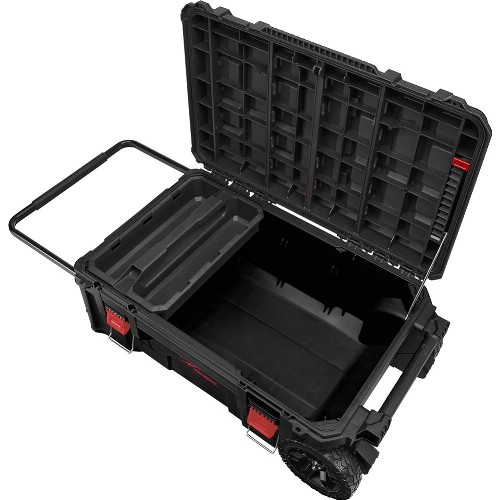 Verktøykasse på hjul. Utstyrt med doble fester på lokket for Packout-moduler. 23 cm terrenghjul for enkel transport. Uttrekkbart håndtak. Beskyttende lokkforsegling for å forhindre skade på verktøyene fra vann og støv. Ekstra lagringskapasitet for store verktøy og andre materialer. Konstruert av slagfaste polymerer for økt holdbarhet. Maks belastning 113 kg. Inkludert i Milwaukees Packout modulære lagringssystem.