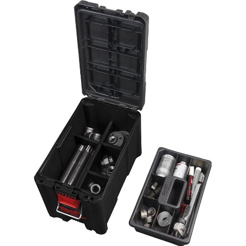Verktøykasse med lett justerbare fordelerrom for for eksempel tilbehør, kjever, fugemasse etc. Tilstrekkelig lagringskapasitet til å romme elektroverktøy som sirkelsager, kverner, skrutrekkere. Konstruert med slagfaste polymerer. 34 kg vektkapasitet. Støv- og vanntett, IP65. Inkludert i Milwaukees Packout modulære lagringssystem.