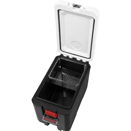 Dobbel premium isolasjon holder innholdet kaldt opp til 30 timer. IP 65 Forhindrer lekkasjer og beskytter innholdet mot smuss og skitt. Integrert flaskeåpner. Avtakbart brett for separat lagring av personlige gjenstander for å holde dem høyere enn is og vann. 15 liter kapasitet. Konstruert med slagfaste polymerer for holdbarhet på arbeidsplassen. En del av Packout systemet.