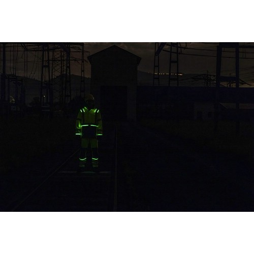 Fôret vinterjakke i vanntett og vindtett Helly Tech Performance materiale som puster. Etterglødefunksjon med VizLite DT som benytter fosforescerende teknologi som absorberer UV-lysenergi fra naturlig eller kunstig lys som deretter overføres som et etterglødende lys ved lave eller ingen lysforhold. Lader på 5 minutter i dagslys og 10 minutter fra belysning og skinner deretter i 8 timer og er synlig på 200 m. Trenger ingen batterier og tåler industrivask. Vannsøyle 10000 mm, pusteevne 10000 g/m²/24 t. Avtakbar hette som kan brukes med hjelm, med vertikal og horisontal justering. Polstret krage med børstet polyester på innsiden. YKK glidelås foran med hakebeskyttelse. Ingen skuldersømmer. Håndlommer med YKK-glidelås og børstet fôr. Napoleon lomme. Løkke for ID-kort. Forbøyde ermer og justerbare mansjetter. Justerbar kant med elastisk snøring på innsiden av håndlomme. Glidelås for montering av dekal. Forlenget bakende. Vaskes 40°C.