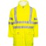 Flammehemmende HI-VIS regnjakke i PU kvalitet. Stor fast hette med snøring som passer over hjelmen. Skjult glidelås med trykknapper. Trykknapper ved ermer og over frontlommene. To lommer i front. Vaskes på 40°C.