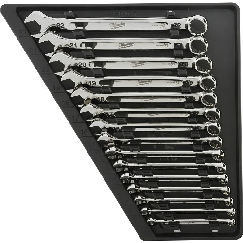 U-ringnøkkelsett i 15 deler. Nøkler med Max Bite åpent grep som reduserer avrunding. Avrundet ergonomisk grep. Blekkstemplet for bedre synlighet. Vinklet 15° for bedre tilgjengelighet. Laget av kromlegert stål, kromfinish. Leveres i praktisk holder med bærehåndtak.