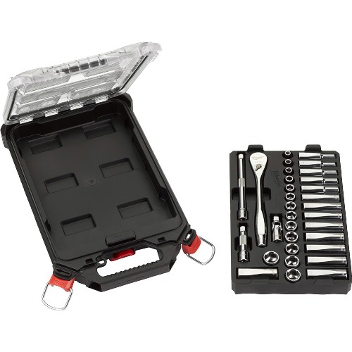 32-delers pipenøkkelsett med 3/8" feste. Med 90-tanns skralleskaft, 4° vinkel for trange plasser. Korte og lange sekskantpiper, forlenger og universalknute. Inngår i Milwaukees moduloppbevaring systempakke Packout. Leveres i sortimentsboks Packout kompakt slim.