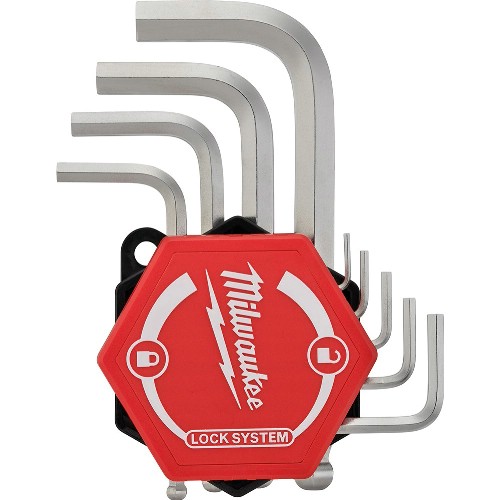 Sekskantnøkler med kuleende for opp til 30° tilgang til skruen. Størrelsesindikator, og hull for enkel festing til Milwaukee-sikkerhetsserie som kan brukes i høyden. Nøklene sitter i et hylster som enkelt vris 90° for enkel tilgang til nøkler.