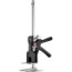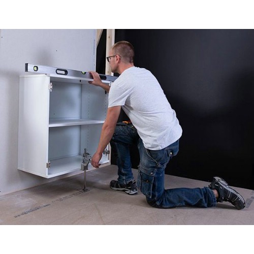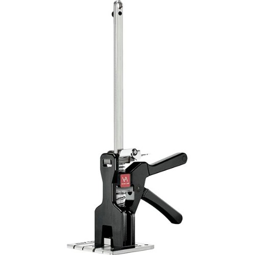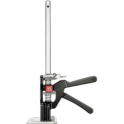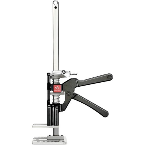 Kraftig løfte- og spennklemme med enhåndsgrep. Løfte- og klemkraft på 150 kg. Løfter opp til 215 mm. Spennvidde på maksimalt 385 mm. Laget av stål og aluminium. Fungerer som en hjelpende hånd med millimeterpresisjon ved montering av dører, vinduer, skap, kjøleskap, vaskemaskiner og oppvaskmaskiner, bjelkelag, bjelker, ventilasjonsanlegg, gulv og vegger osv. Utstyrt med to knapper for å slippe trykket, høyre senker objektet raskt ned. og venstre senker objektet trinnvis med millimeterpresisjon. Enkelt å endre fra løftefunksjon til presse- og forseringsfunksjon. Bygger kun 6mm inn i den støpte bunnplaten. Bunnplate med tre hull for enkel feste i arbeidsstykket for ekstra stabilitet eller fast montering. 38 mm lange løftegafler. Skinne med 10 mm hull for praktisk oppheng.